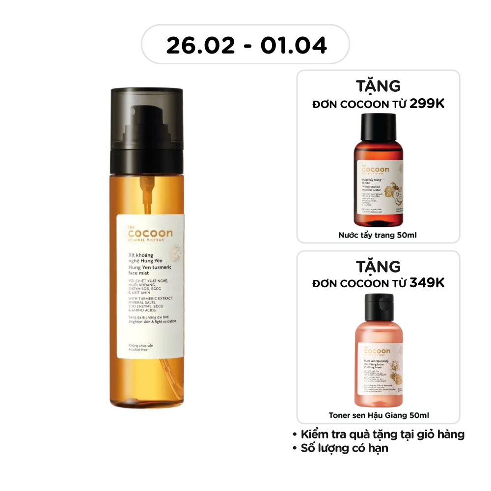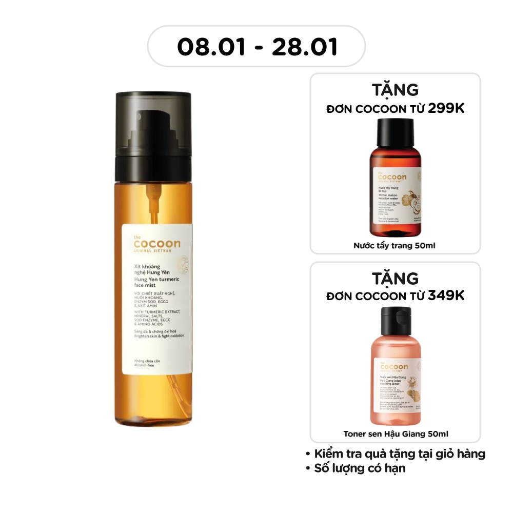 Cocoon Hung Yen Turmeric Face Mist - a fine mist of turmeric extract, mineral salts combined with enzymes SOD, EGCG and amino acids will cover the skin to instantly hydrate, brighten, strong anti-oxidant and protect skin from harmful effects. harmful agents from the environment.