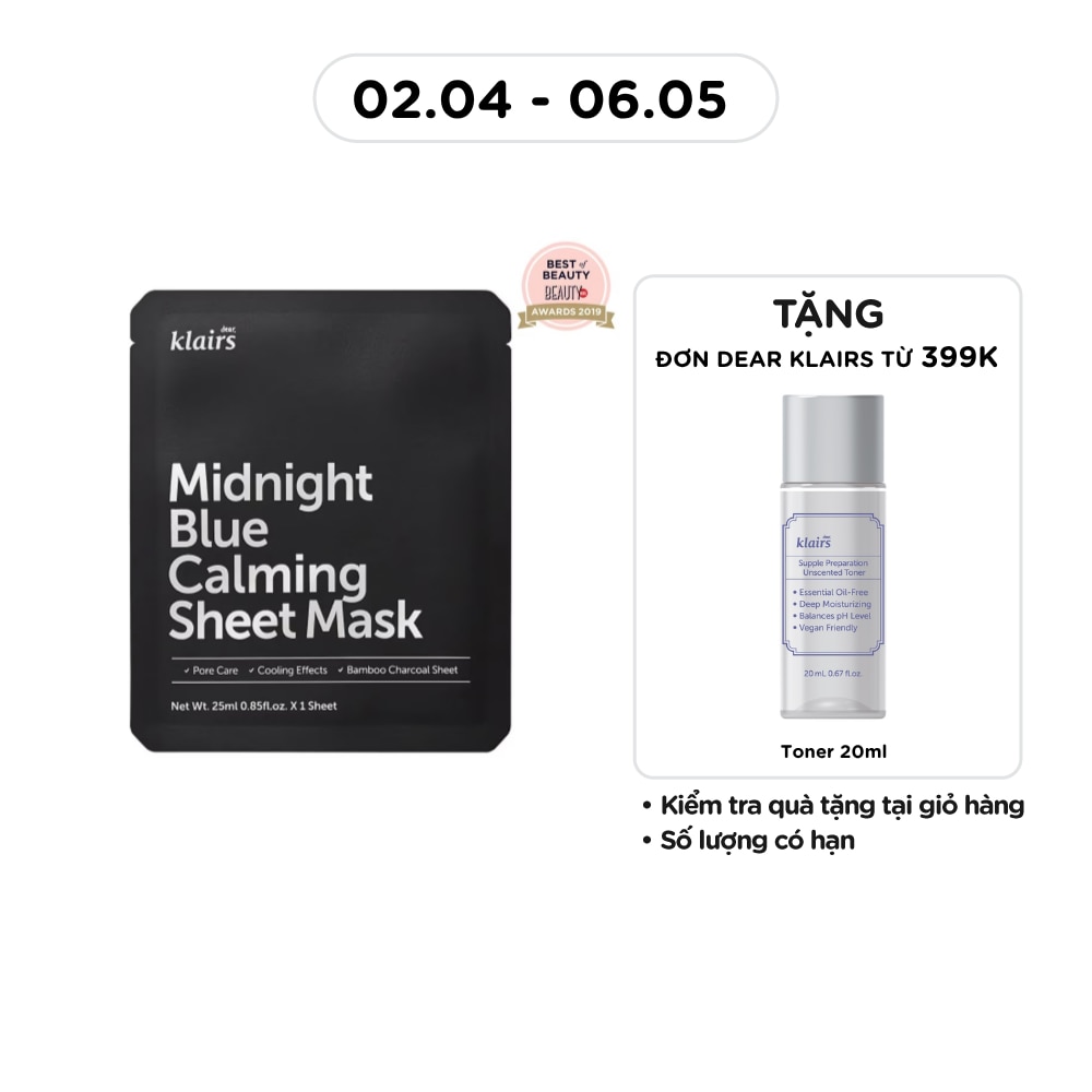 Dear Klairs Moisturizing and Revitalizing Mask Midnight Blue Calming Sheet Mask 25ml with willow extract, Gotu kola, and activated charcoal help prevent sebum secretion of the skin to enlarge pores and reduce the formation of blackheads. In addition, the mask also helps to soothe the skin, reduce irritation and cool the skin, especially those that are hot, burning due to sun exposure, suitable for sensitive skin.