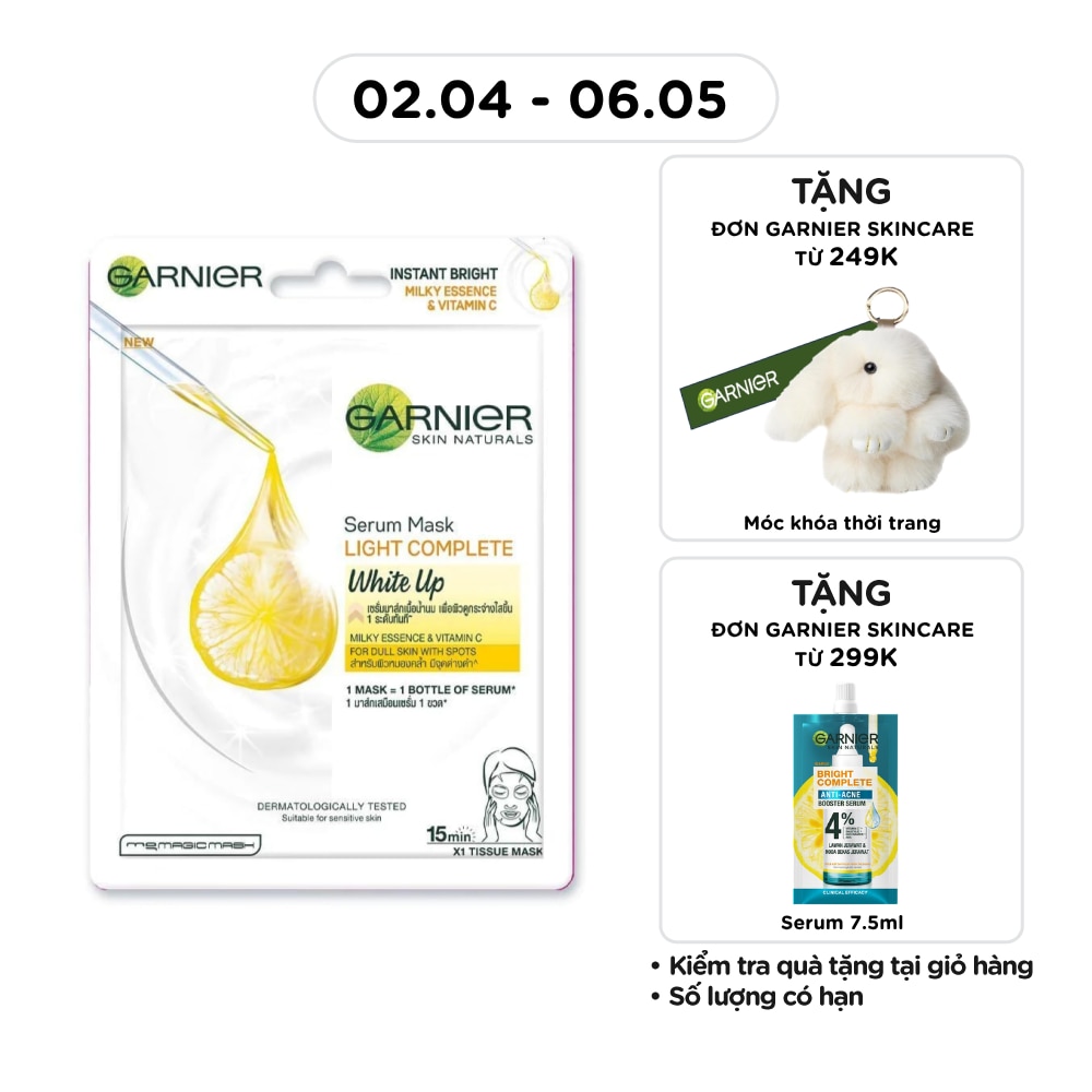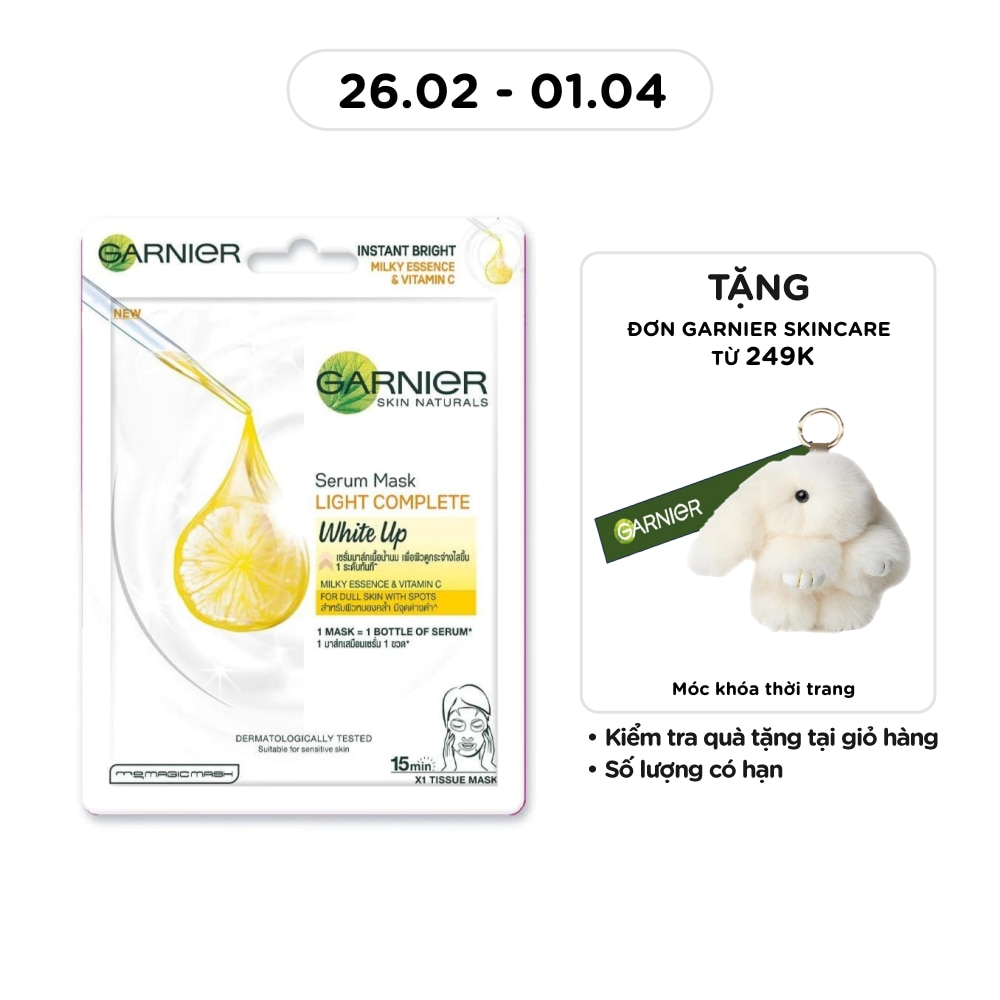- Garnier Serum Mask Light Complete White Up Milky Essence & Vitamin C 28g helps gently exfoliate dull skin cells and dark spots.