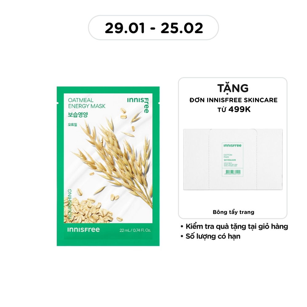 Innisfree Oatmeal Energy Mask 22ml is a mild daily sheet mask filled with the freshness of the ingredients intact, for immediate hydration of tired skin to hydrate and soothe skin that has fluctuating conditions.