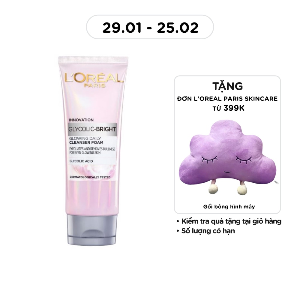 - L'Oreal Paris Glycolic Bright Glowing Daily Cleanser Foam 100ml gently cleans dead skin cells and deeply cleanses the skin.