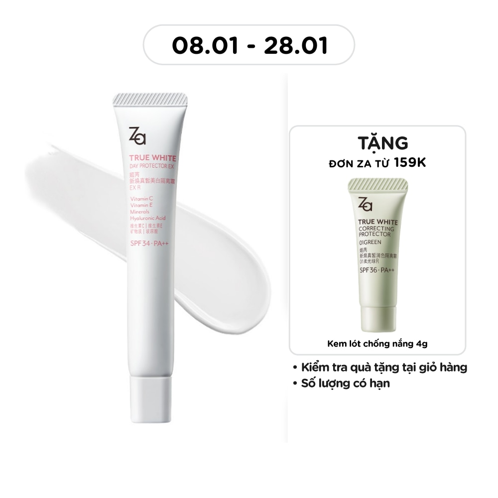 - ZA True White Day Protector EX SPF34 PA++ 35g helps cover yellow and dull skin, evens skin tone, obscures pores, moisturizes and protects skin against the harmful effects of sunlight.