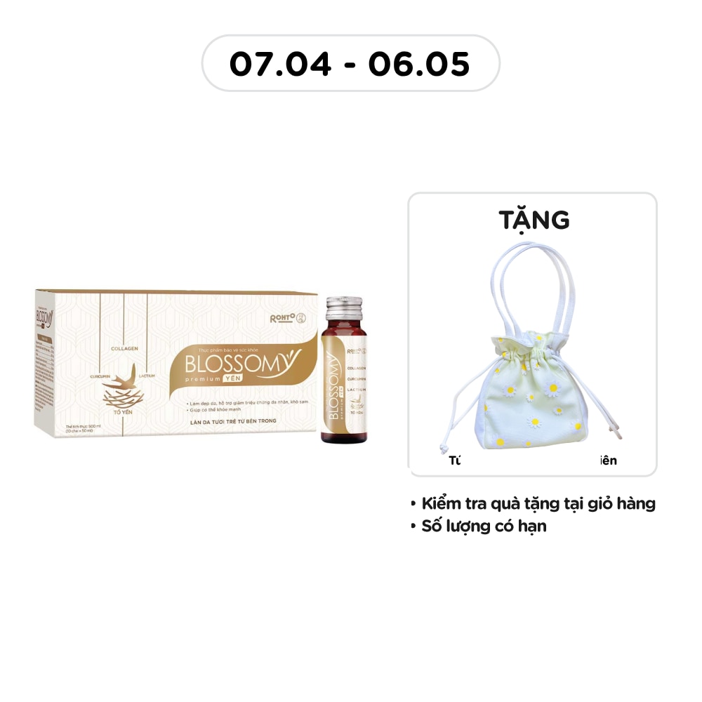- Thực Phẩm Bảo Vệ Sức Khỏe Blossomy Premium Yến Làn Da Tươi Trẻ Từ Bên Trong 50ml x 10 Chai luôn đồng hành cùng nàng mỗi ngày trên chặng đường chăm sóc sức khỏe và sắc đẹp toàn diện từ bên trong.