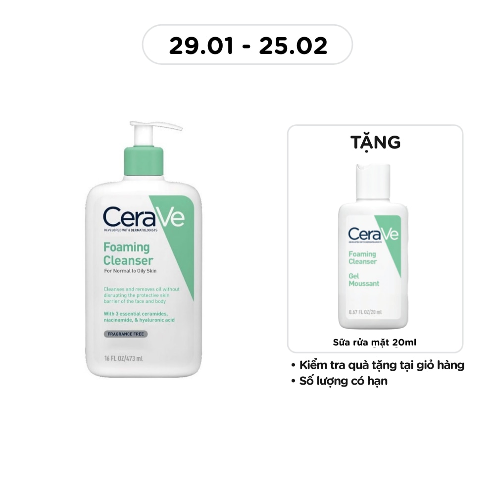 - Sữa Rửa Mặt CeraVe Foaming Cleanser Giúp Làm Sạch Sâu Dành Cho Da Dầu 473ml giúp làm sạch và loại bỏ bã nhờn dư thừa mà không phá vỡ hàng rào bảo vệ da.
