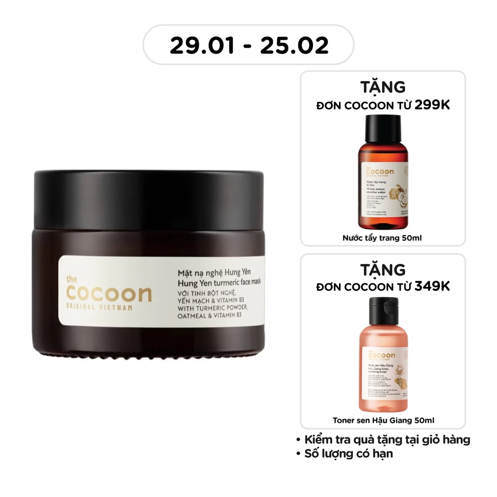 Mặt Nạ Nghệ Hưng Yên Cocoon Turmeric Face Mask Giúp Da Rạng Rỡ & Mịn Màng 30ml với công thức chứa tinh bột nghệ giàu Curcuminoid kết hợp với Vitamin B3 và chiết xuất yến mạch, phù hợp cho làn da xỉn màu và có nhiều vết thâm. Sau khi rửa đi lớp mặt nạ, bạn sẽ nhìn thấy một làn da tươi mới, sáng rạng rỡ và đều màu hơn.