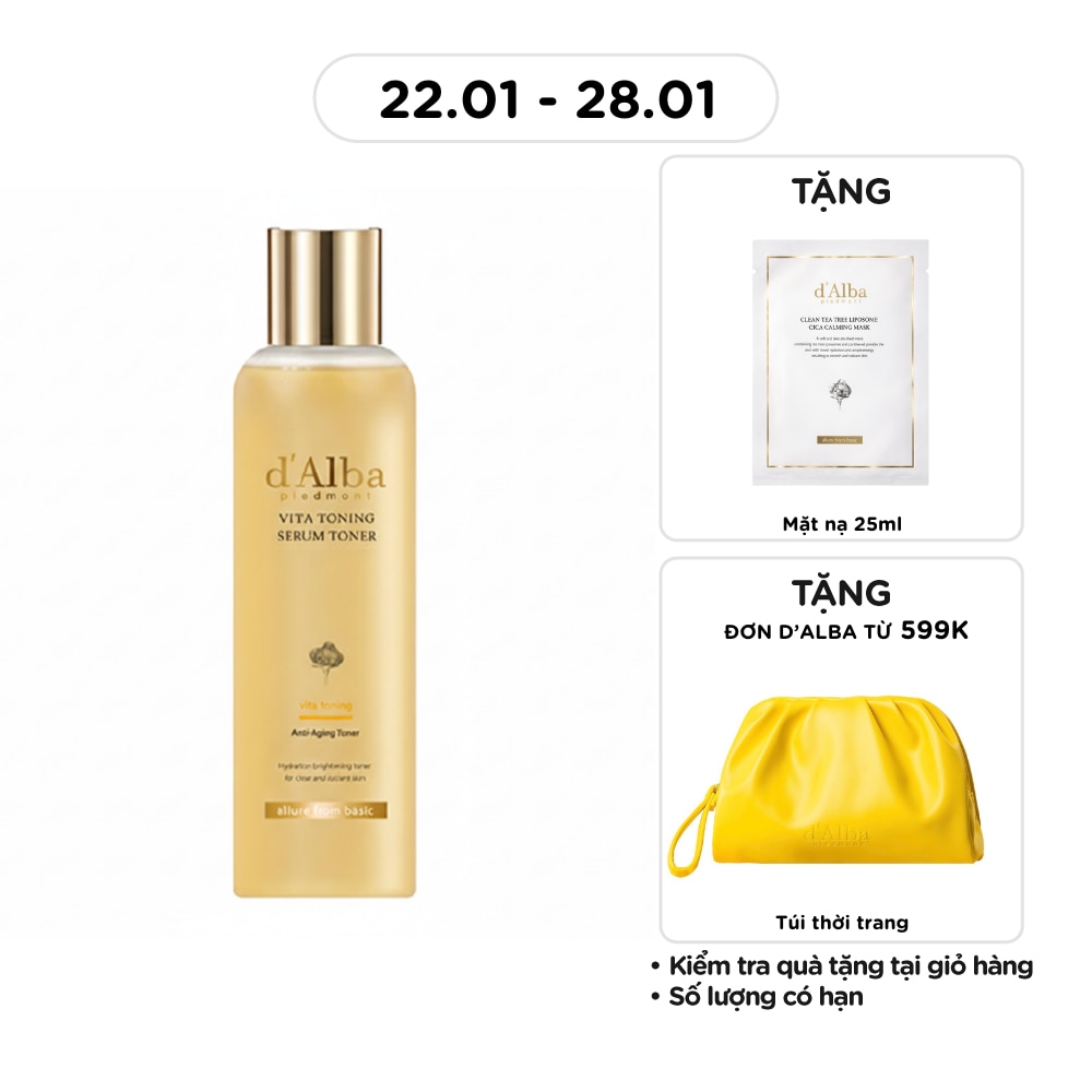 Toner d'Alba Vita Toning Serum Toner giúp cấp ẩm sâu, cải thiện lỗ chân lông và làm sáng da hiệu quả. Công thức kết hợp toner và serum chứa nấm tuyết trắng, Vitamin C, Glutathione, Niacinamide và phức hợp vitamin giúp da mềm mịn, căng bóng, đều màu và rạng rỡ hơn. Kết cấu lỏng nhẹ, thẩm thấu nhanh, phù hợp cho mọi loại da, đặc biệt là da dầu, da lỗ chân lông to và da xỉn màu.