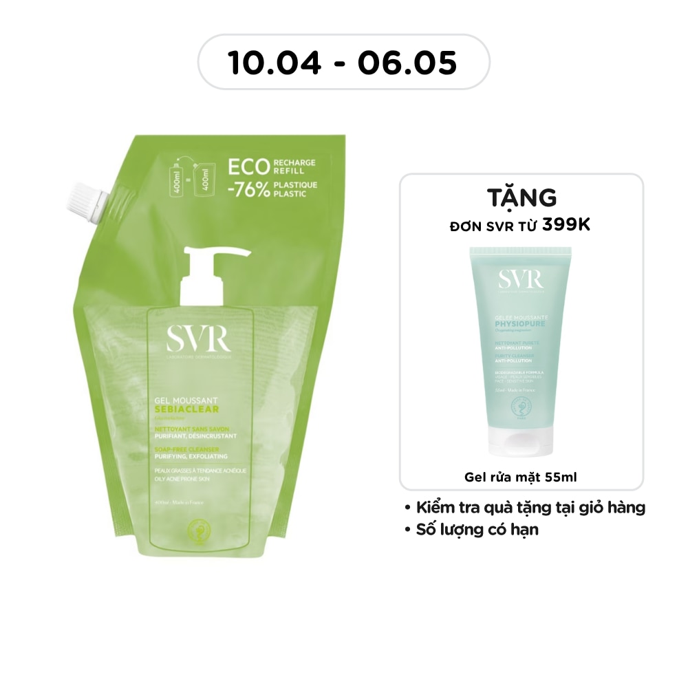 Gel Rửa Mặt SVR Sebiaclear Gel Moussant Dạng Túi Refill 400ml là sản phẩm dành riêng cho da dầu, da nhạy cảm, làm sạch bụi bẩn một cách dịu nhẹ nhất, không gây tổn hại cho da. Sản phẩm với các thành phần từ dược, lành tính và an toàn cho làn da, không chỉ loại bỏ bụi bẩn mà còn có tác dụng lấy đi lớp sừng già trên da, góp phần thúc đẩy quá trình tái tạo tế bào da, trả lại cho bạn làn da sạch đẹp, sáng khỏe và căng tràn sức sống.